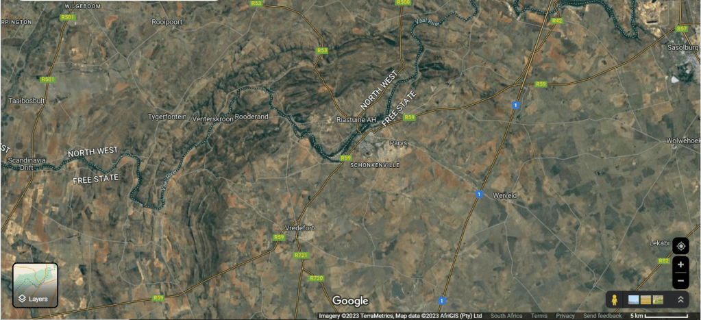 The Vredefort Dome is located due east of Potchefstroom and straddles the Vaal River which is the boundary between the North-West and Free State provinces (see Fig 3).