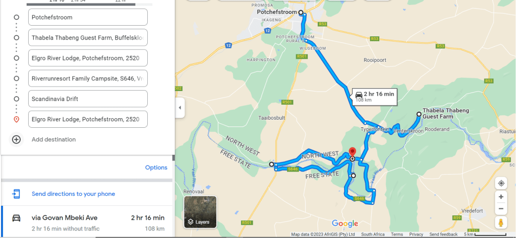 The Elgro River Lodge is located 30km east of Potchefstroom on the Vaal River (see Fig 5) – the red marker indicates the location of the Elgro River Lodge. The dome area offers numerous alternative birding drives such as Kopjeskraal, Rooipoort and the Kromdraai road west of the Scandinavia Drift Hotel.