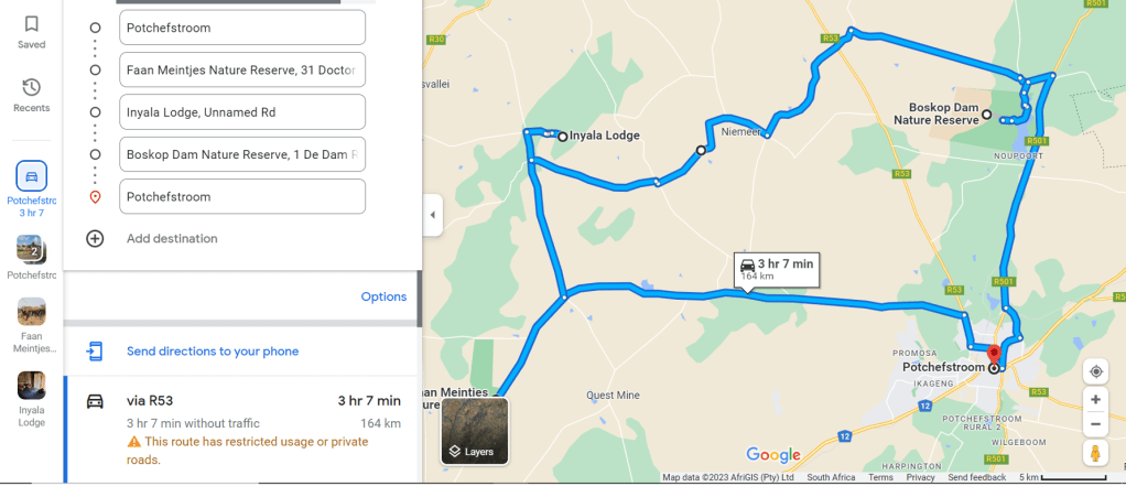 Slow birding of the Eleazer Road and Faan Meintjes with a braai or picnic at the picnic site can easily take a full day. Overnighting at Inyala Lodge, before returning to Potchefstroom may be a good option.